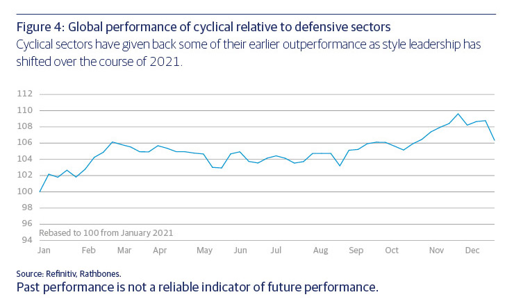 Following the November 2020 announcement of effective vaccines, market leadership shifted to the sectors and stocks that had underperformed through the initial pandemic crisis and would benefit from a normalisation of economic activity (figure 4). Companies that become known as ‘recovery’ stocks were found in both traditional value areas (which typically trade at lower valuations), such as energy and banks and so called ‘cyclical’ companies that are more geared to economic recovery, such as travel and leisure, which had suffered from COVID-related closures and weakened demand.