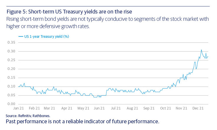 Further uncertainty surrounds the pace and timing of monetary tightening as authorities respond to inflationary pressures proving less transitory than had been initially expected. Rising short-term bond yields (figure 5) are typically not conducive to segments of the market with higher or more defensive growth rates. As more of their price today is determined by future earnings (compared with the average company), they are more sensitive to these short-term yields, which provide the discount rate that is used to translate tomorrow’s earnings into today’s money. Yet some of the leaders in these sectors have thrived and indeed re-rated in what is turning out to be a productive environment for stock selection.